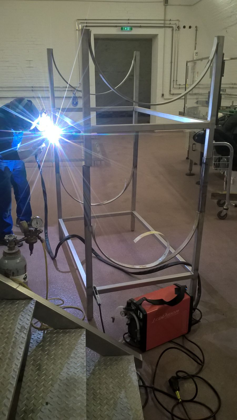 Es ist unglaublich, wie viel Unterstützung wir von allen Seiten beim Aufbau bekommen. Heute ging es an die Gestelle für unsere liegenden Lagertanks, die jeweils 1.000 l Jungbier aufnehmen können. Damit bei dem Gewicht das Bier sicher in der Kühlung reifen kann, haben wir die Gestelle mit großartiger Unterstützung am Schweißgerät verstärkt.